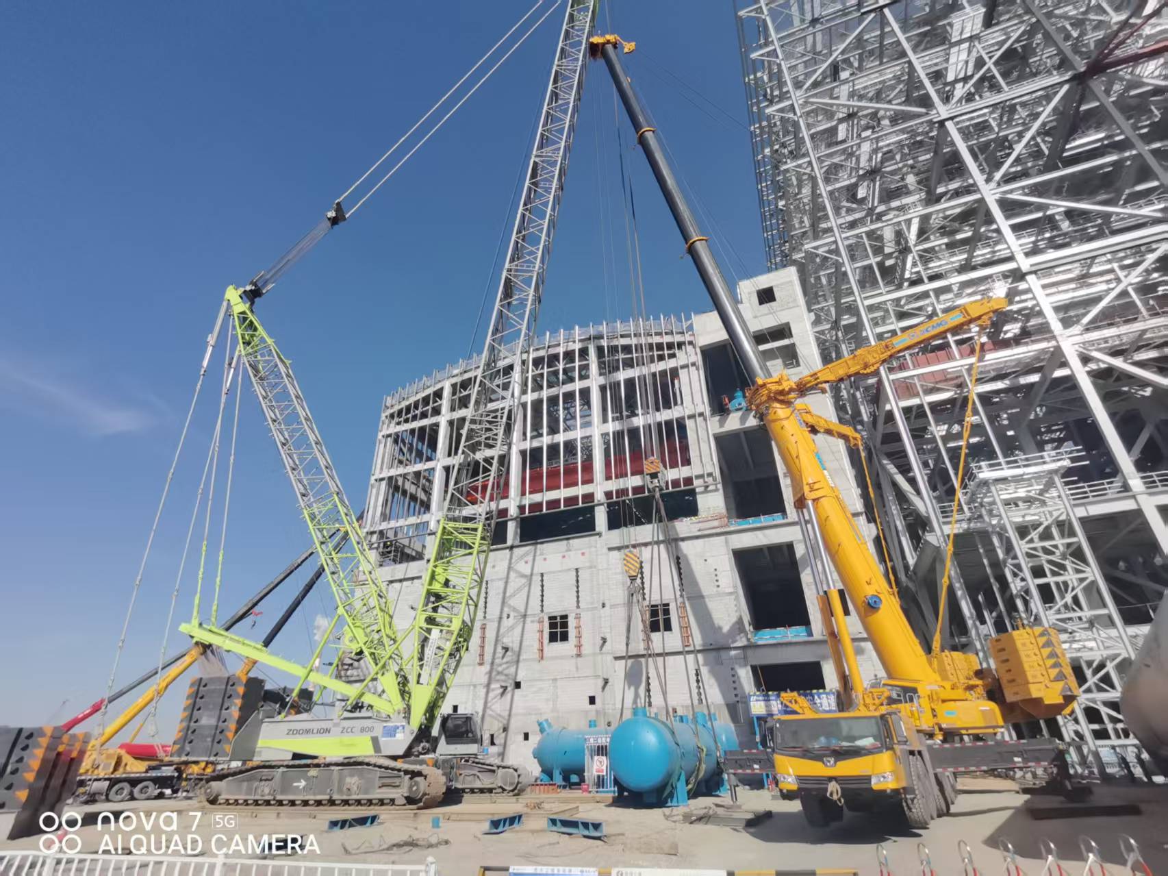 本次吊装的两台高压加热器由哈尔滨锅炉厂有限责任公司制造。其中 #0 高压加热器长 8.9 米、宽 3.2 米、高 3.7 米,净重 123.2 吨;#3 高压加热器长 12 米、宽 3 米、高 3.3 米,净重 113.5 吨。设备安装于主厂房 26.5 米层 B-C 跨,因主厂房已封顶,常规吊装路径受限,项目部专项策划采用 “主吊 + 溜尾配合” 方案,选用履带吊为主吊设备,汽车吊配合完成溜尾及穿装工序,保障吊装路径通畅。