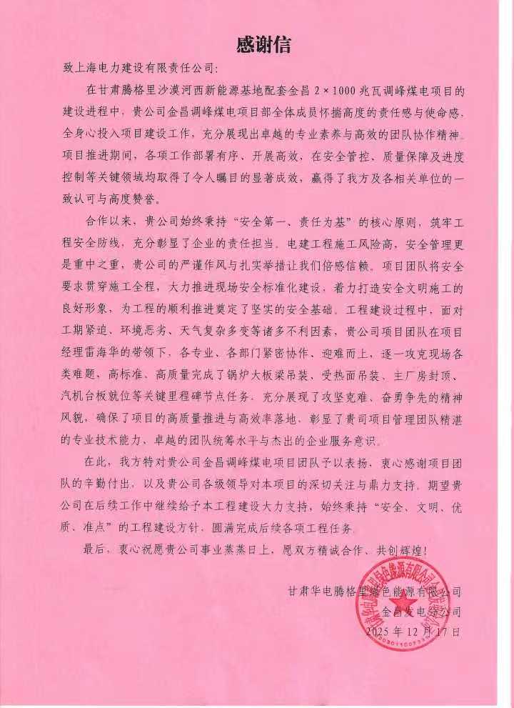 大漠砺剑铸精品 一纸感谢信传赞誉 ——金昌调峰煤电项目团队获业主致信感谢 | |